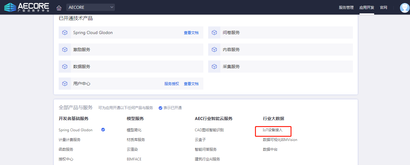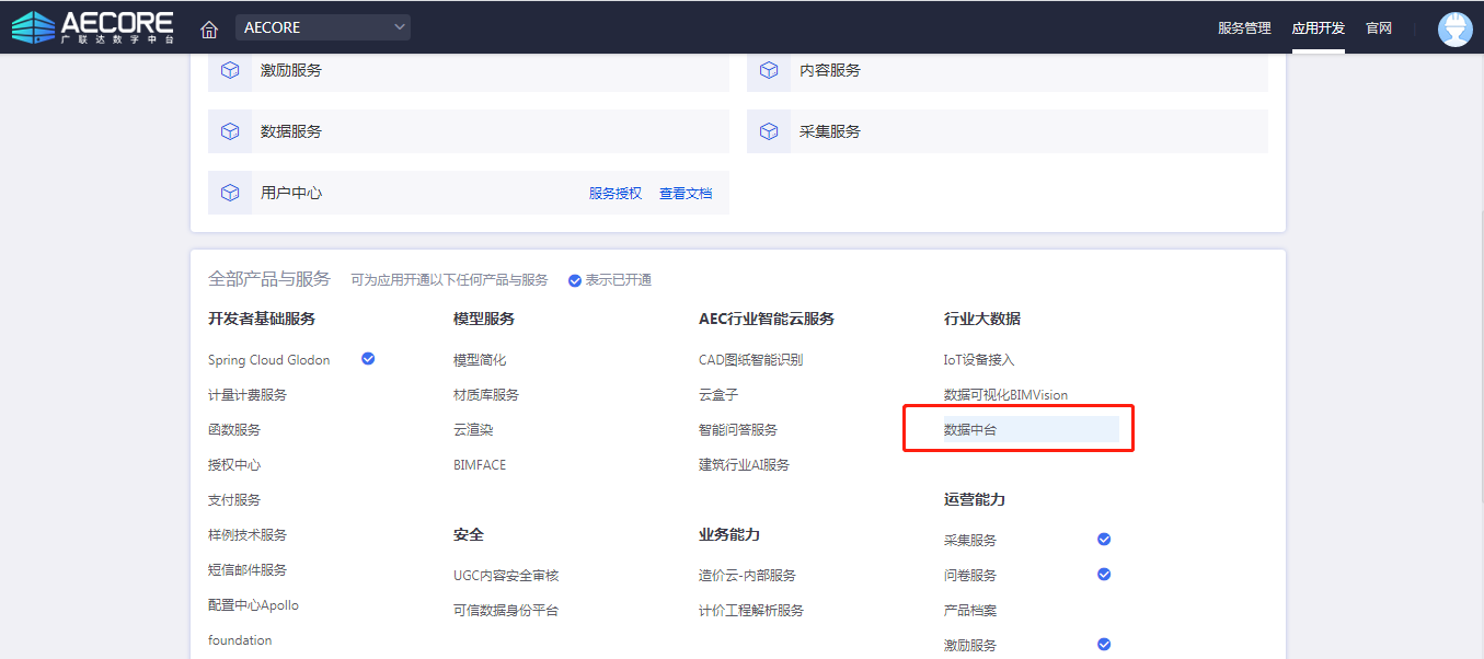 step1:登录AECORE,创建应用,开通开云官方数据中台服务;