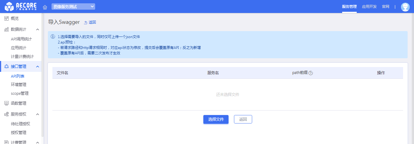 批量导入swagger,选择文件,请填写对应的服务名称(尤其是在多微服务的情况下),以便于后期根据服务名称筛选API。