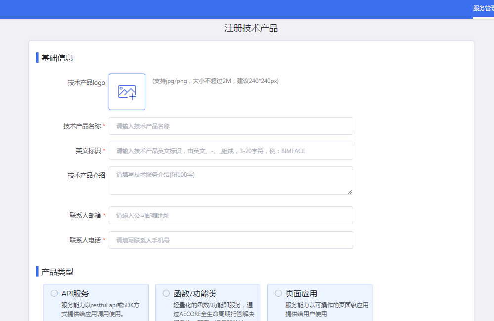 技术产品名称、英文标识(全局唯一,用于标识服务,请起有意义的名称)、技术产品简介、联系人邮箱与电话,选择服务类型(本节主要讲述API类型服务)
