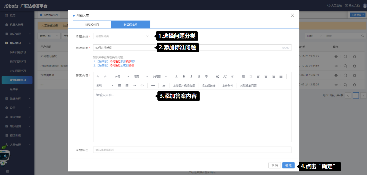 问题入库时,有新增相似问和新增标准问两种形式,根据用户问法的实际情况选择方式入库。