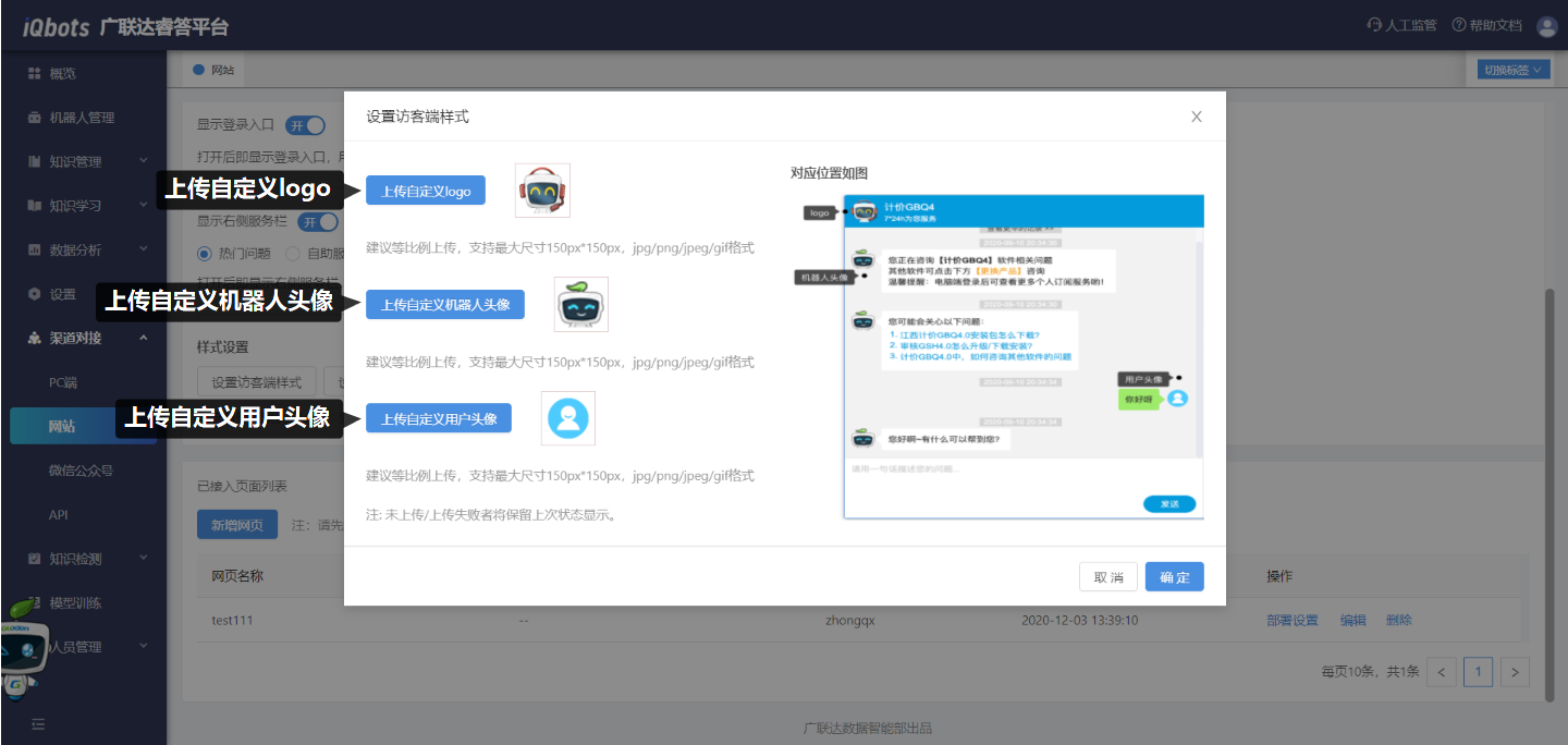 支持访客端样式设置,可上传自定义logo、自定义机器人头像、自定义用户头像;