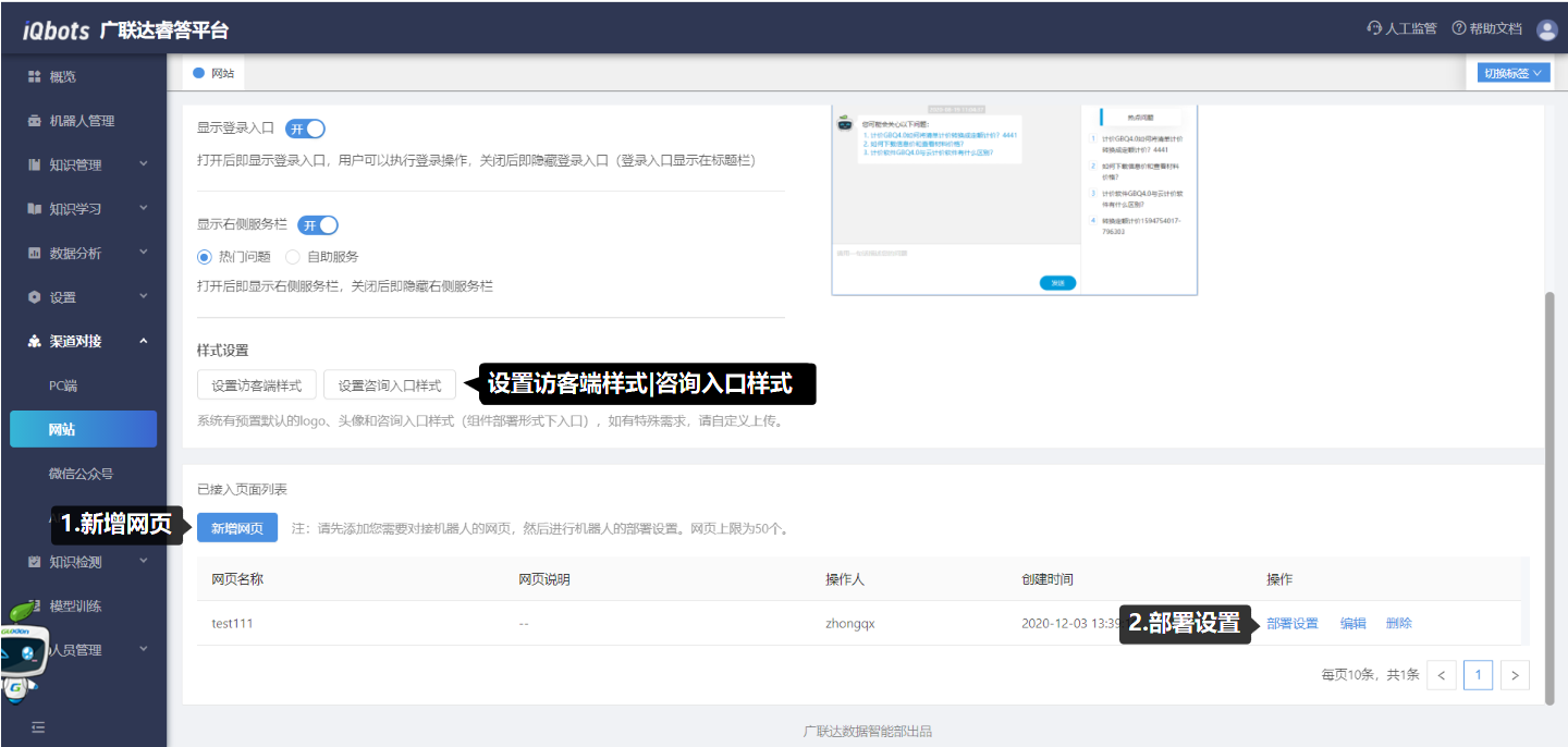 接入步骤:(1)选择需要接入的机器人;(2)点击“新增网页”,根据实际情况填写需接入的网页相关信息;(3)点击“部署设置”,按照提示选择一种部署方式即可完成对网站的部署,部署设置成功即对接成功。