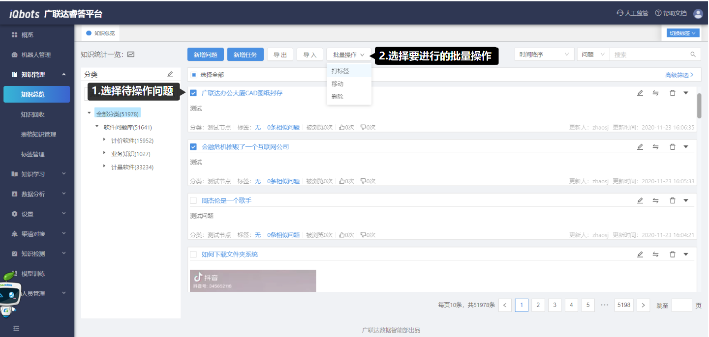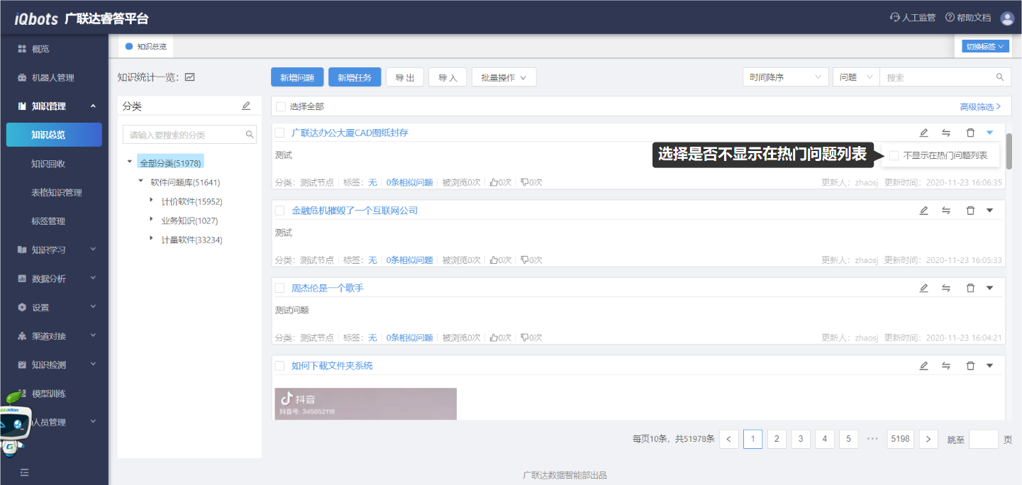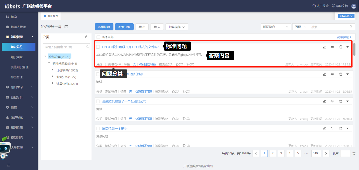 在知识总览页面,可以完成知识分类管理、问题的增删改查、问题的相似问法管理等。