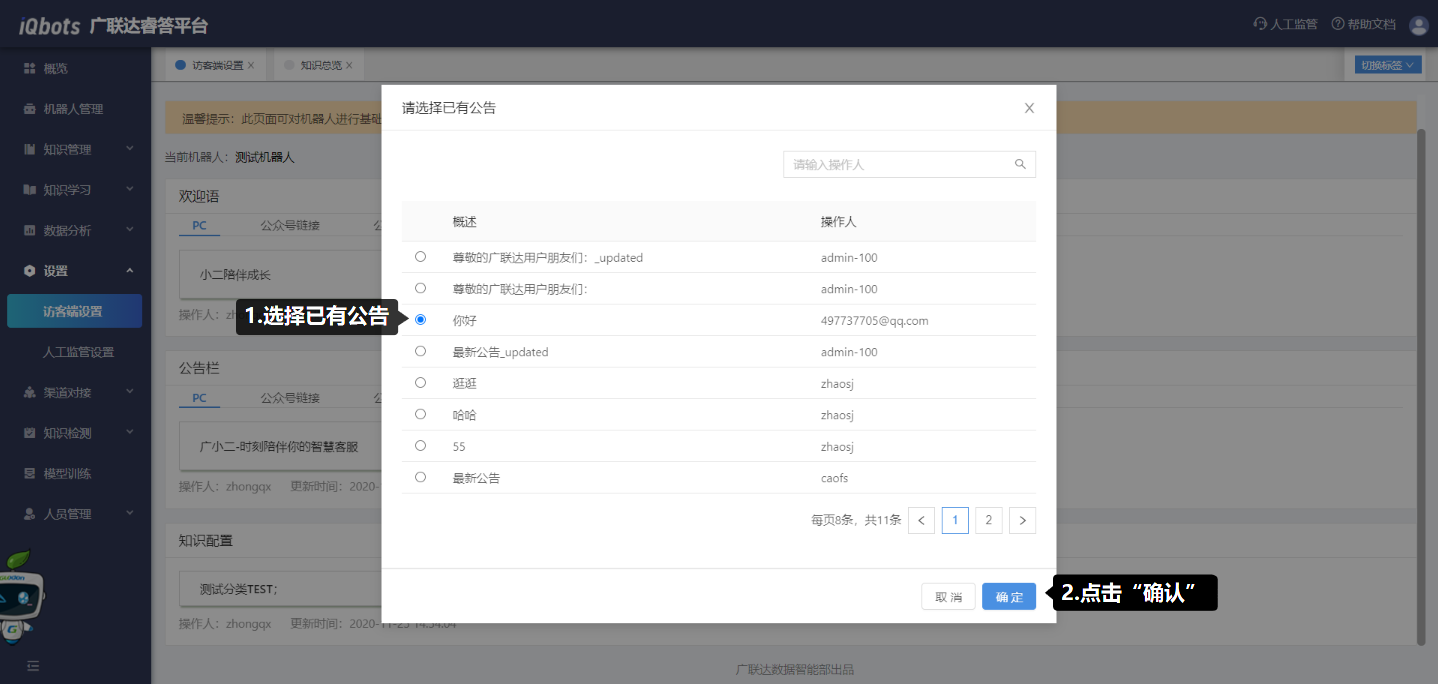 在访客端设置模块中,可以配置不同渠道下的机器人欢迎语文案、公告栏文案和对应的知识。