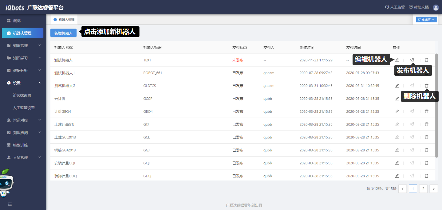 在机器人管理模块中,可以新建机器人、发布机器人、编辑已存在机器人的名称,以及删除建好的机器人。