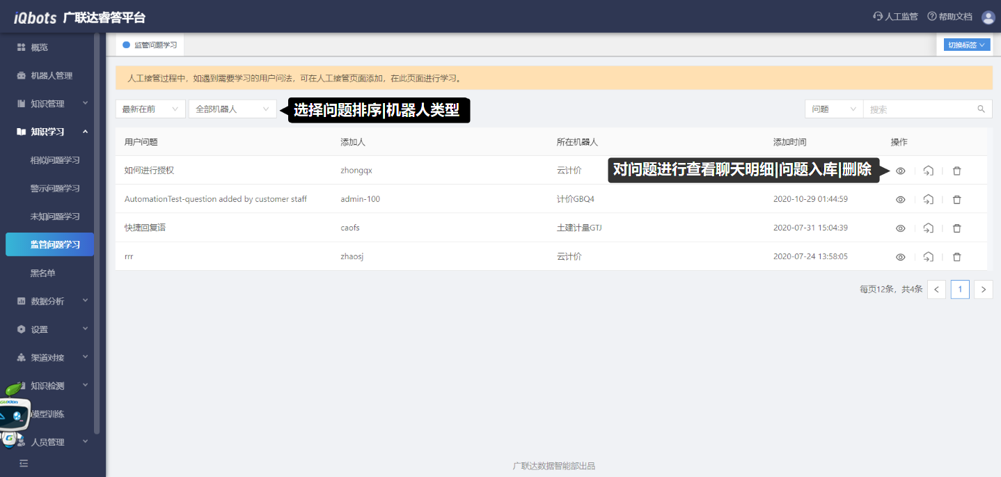 监管问题学习模块是人工接管页面手动添加的需要学习的用户问法汇总。用于在接管过程中,收集有用的用户问法,进而完善知识库。
