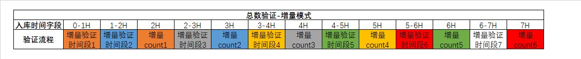 增量模式示意图见Fig 11,其中0H代表验证开始(整时),相同颜色代表一组需要增量验证的时间段和验证执行的时间,每一小时更新一次需要增量验证的时间段,在一小时后对数据目标中需要时间段对应的数据进行count计数,并与数据来源进行验证。