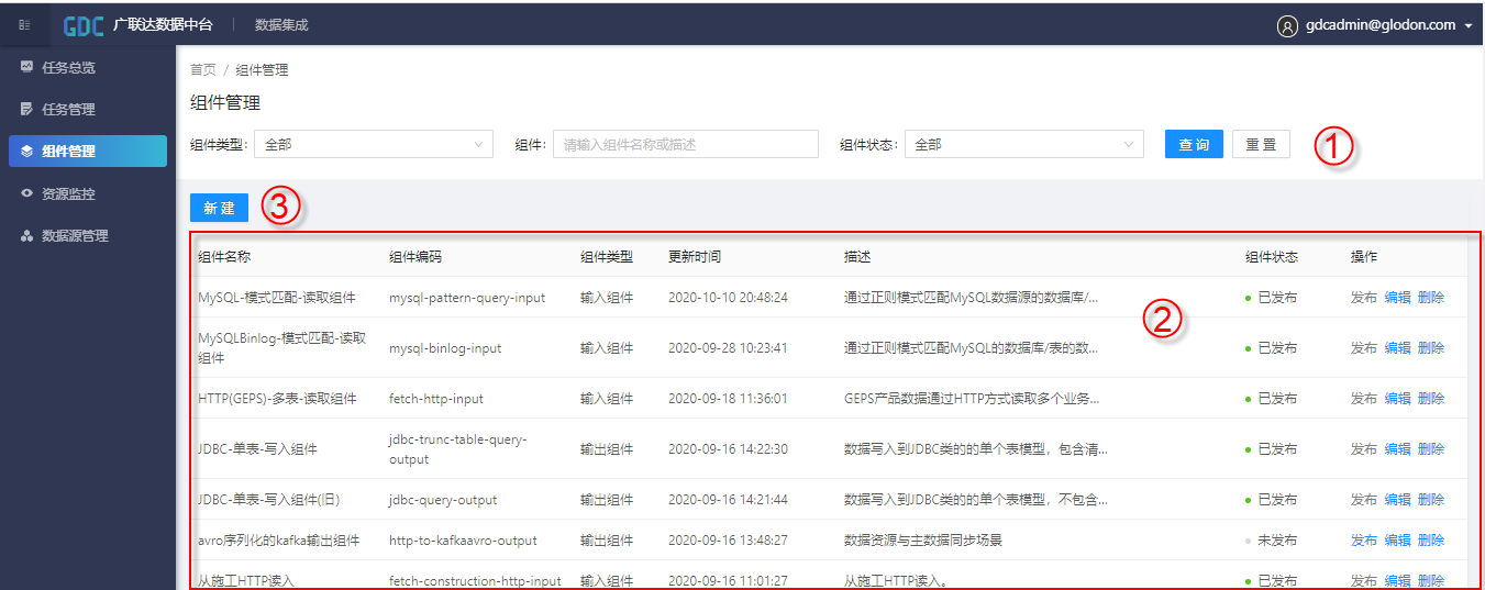 组件管理:数据集成组件的新建、修改、删除、发布等。