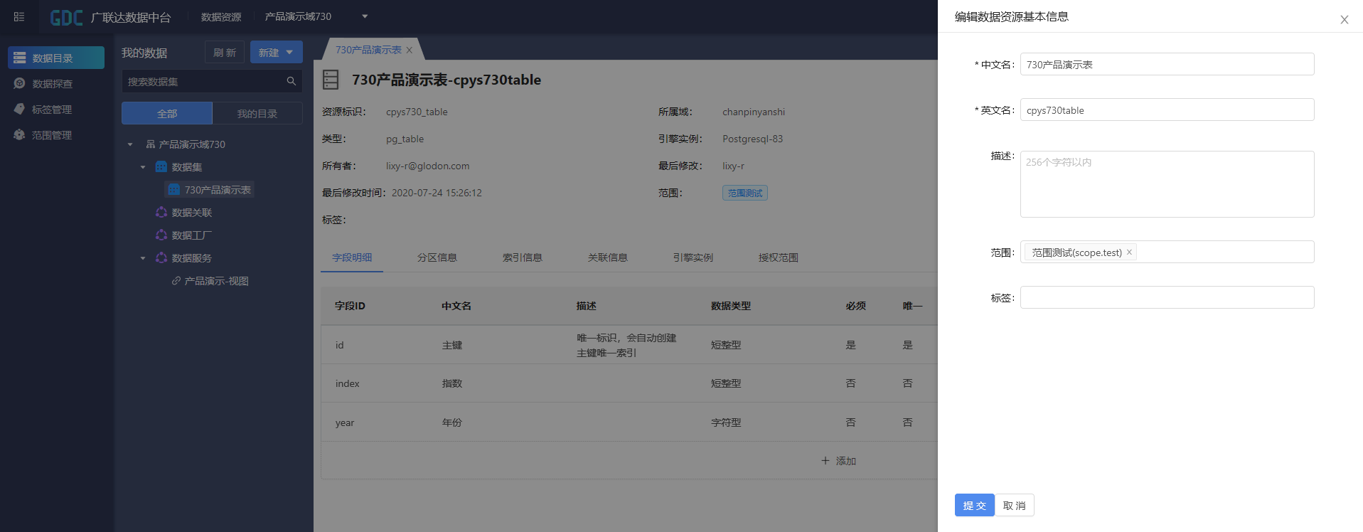 ④当前数据资源的其他信息,包括字段信息、分区信息、索引信息、关联信息、引擎实例和范围授权。