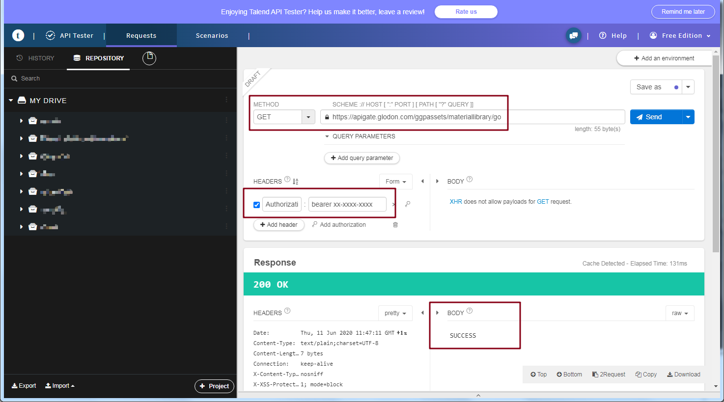 点击Send,测试接口,如果返回SUCCESS,表示API接口调动成功,已经成功了开通材质库服务。