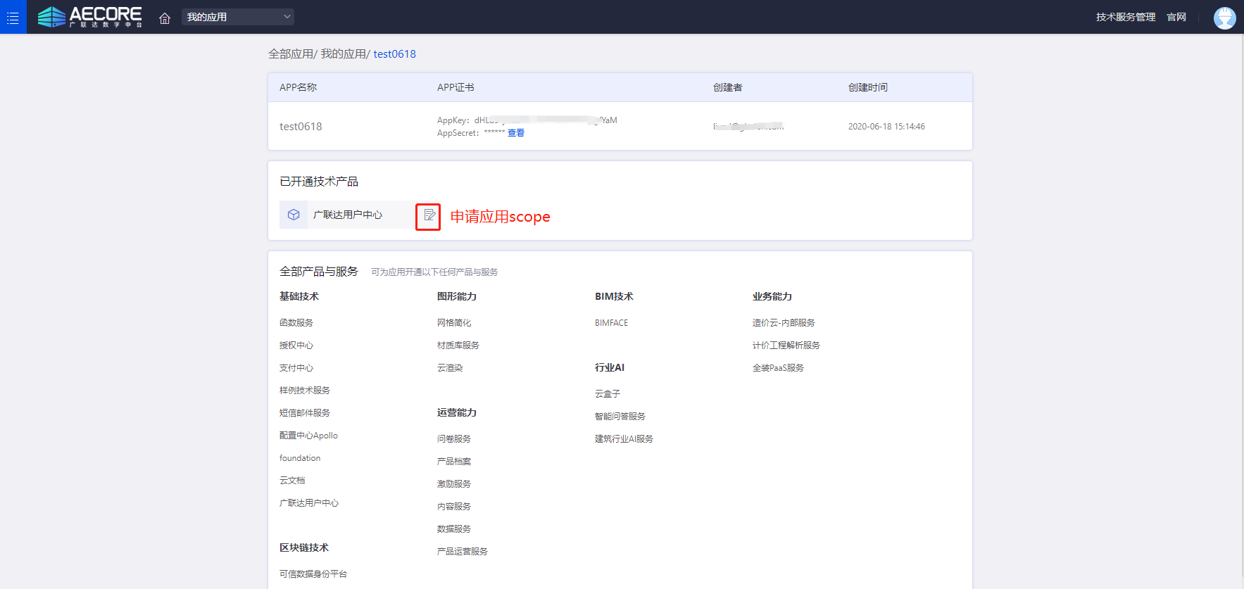 应用创建成功后即刻进入到应用详情页,在应用详情页,你可以查看应用证书(即appkey和appsecret),可选择AECORE平台上上架发布服务,进行服务开通订阅。