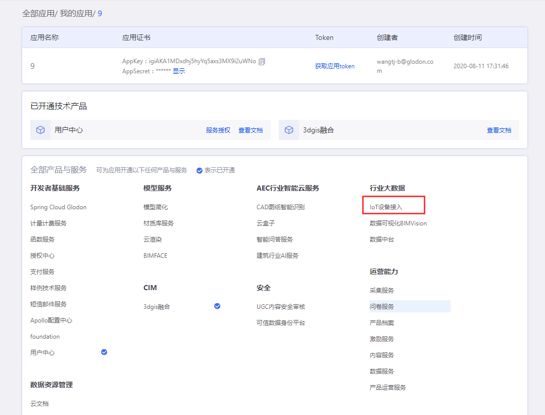 登录AECORE,并创建应用,创建应用后即可获取appkey、appsecert,这是调用服务的秘钥请妥善管理。