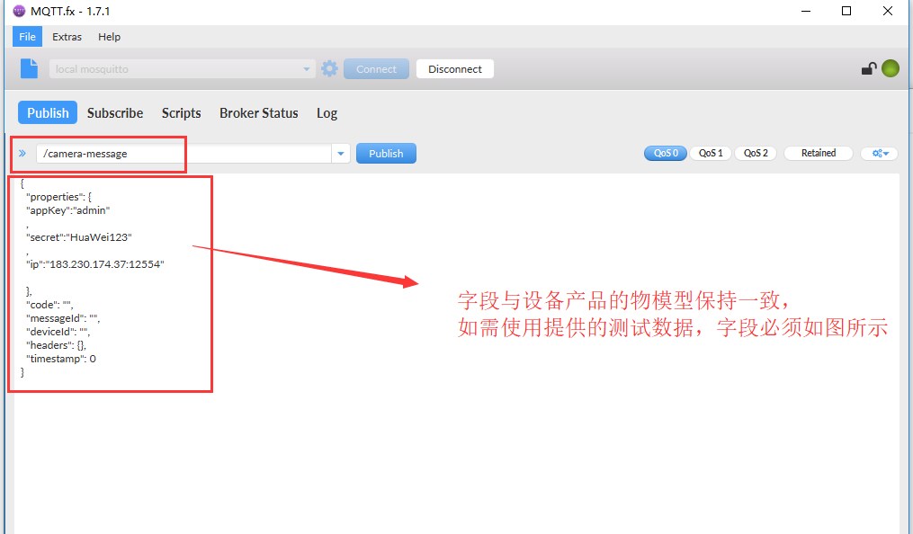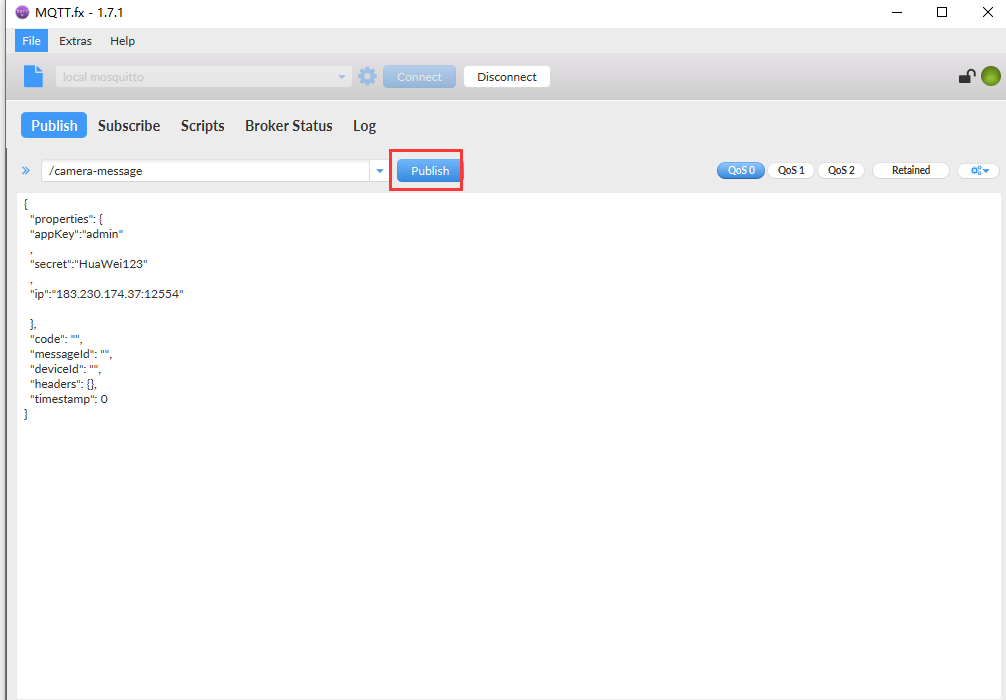 【broker address、broker port】为设备的ip地址和对应端口号,模拟时ip地址为【124.70.68.64】,端口号为【1883】。
