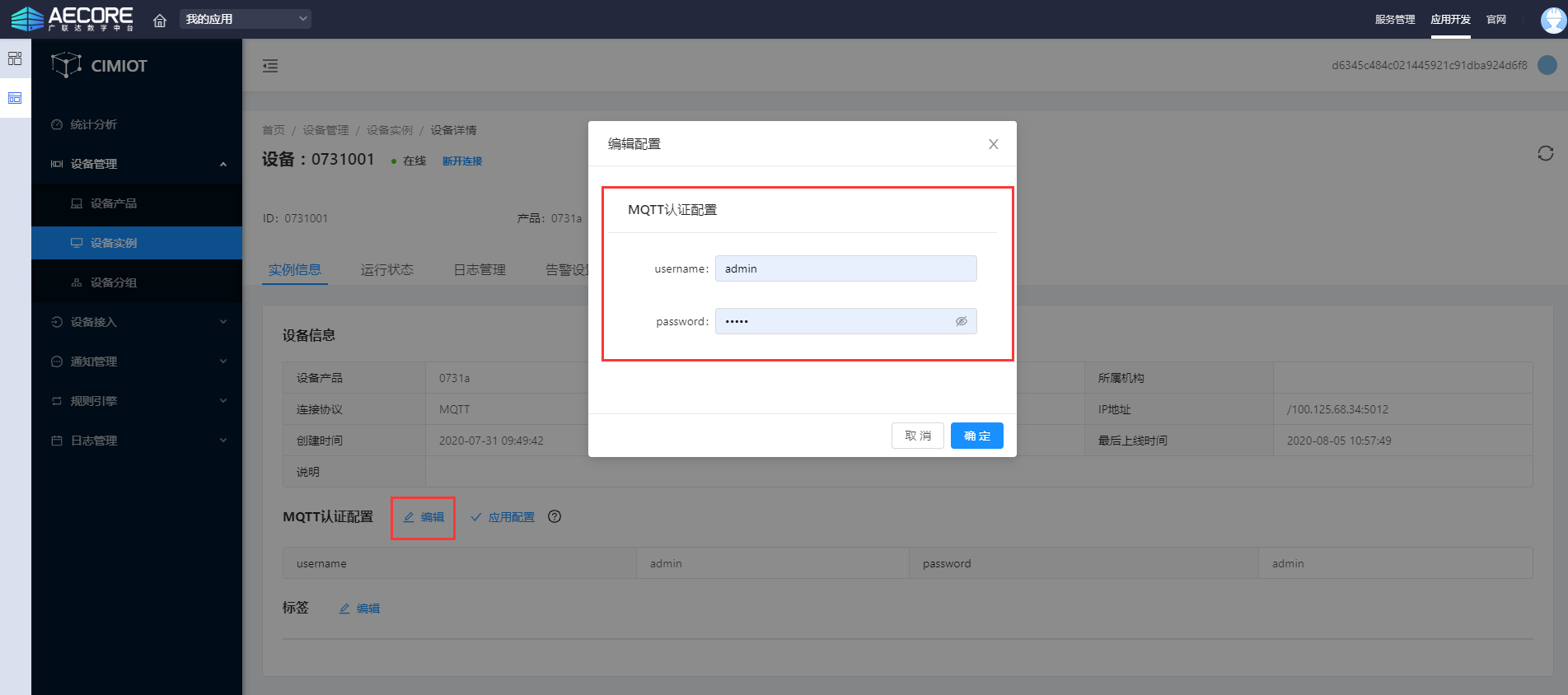 同时,返回物联网设备接入平台,刷新该设备,设备状态会由【离线】变为【在线】,如下图: