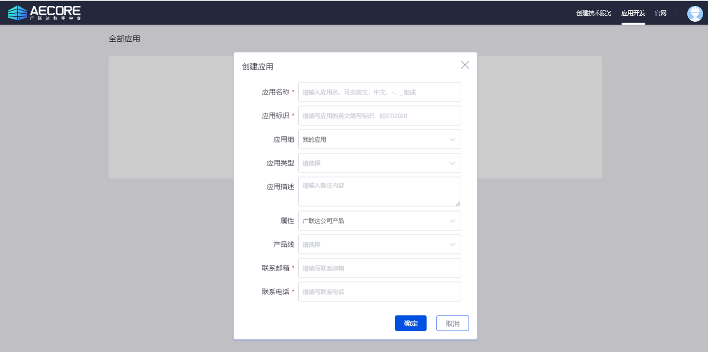 登录AECORE,并创建应用,创建应用后即可获取appkey、appsecret,这是调用服务的秘钥请妥善管理。