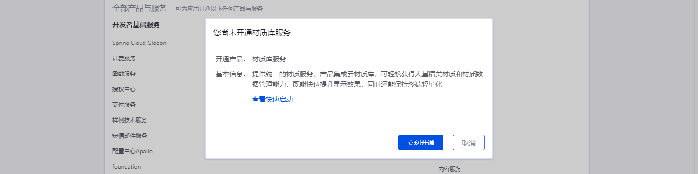 应用创建后选择并开通材质库服务,申请应用scope