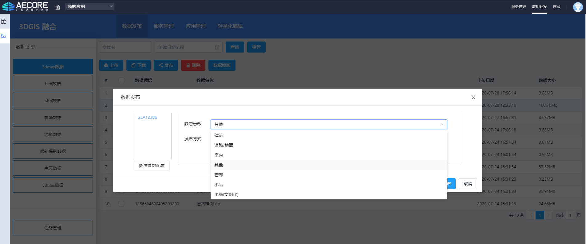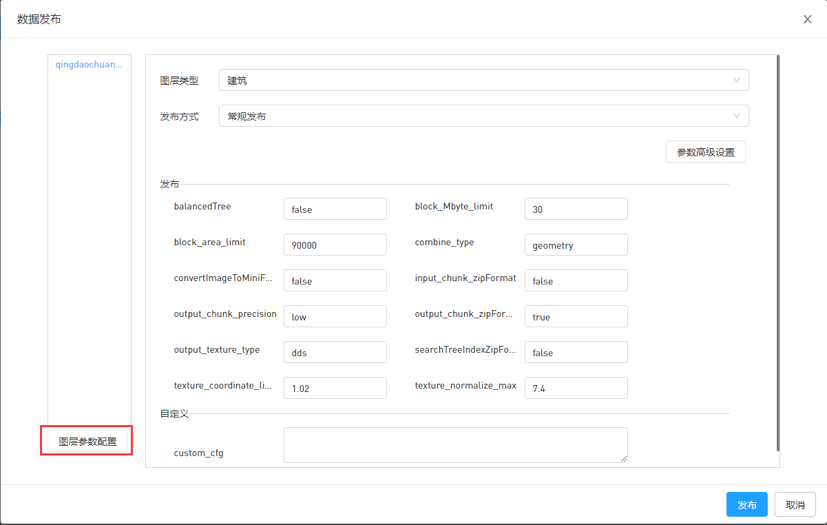选择【图层类型】和【发布方式】,系统将3dmax的数据类型和常见发布方式进行了组合,默认给出了各组合的最优建议参数,用户可以无需修改任何参数,直接发布即可。