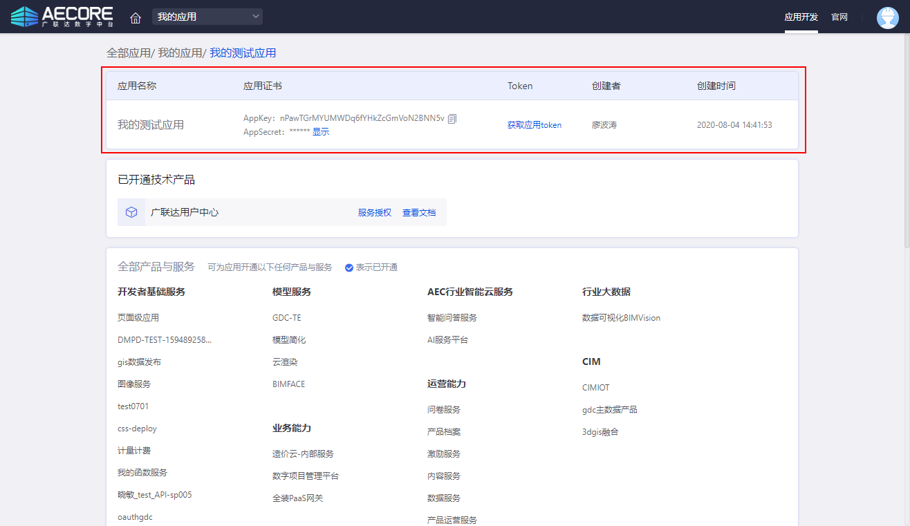 登录AECORE,并创建应用,创建应用后即可获取appkey、appsecret,这是调用服务的秘钥请妥善管理。