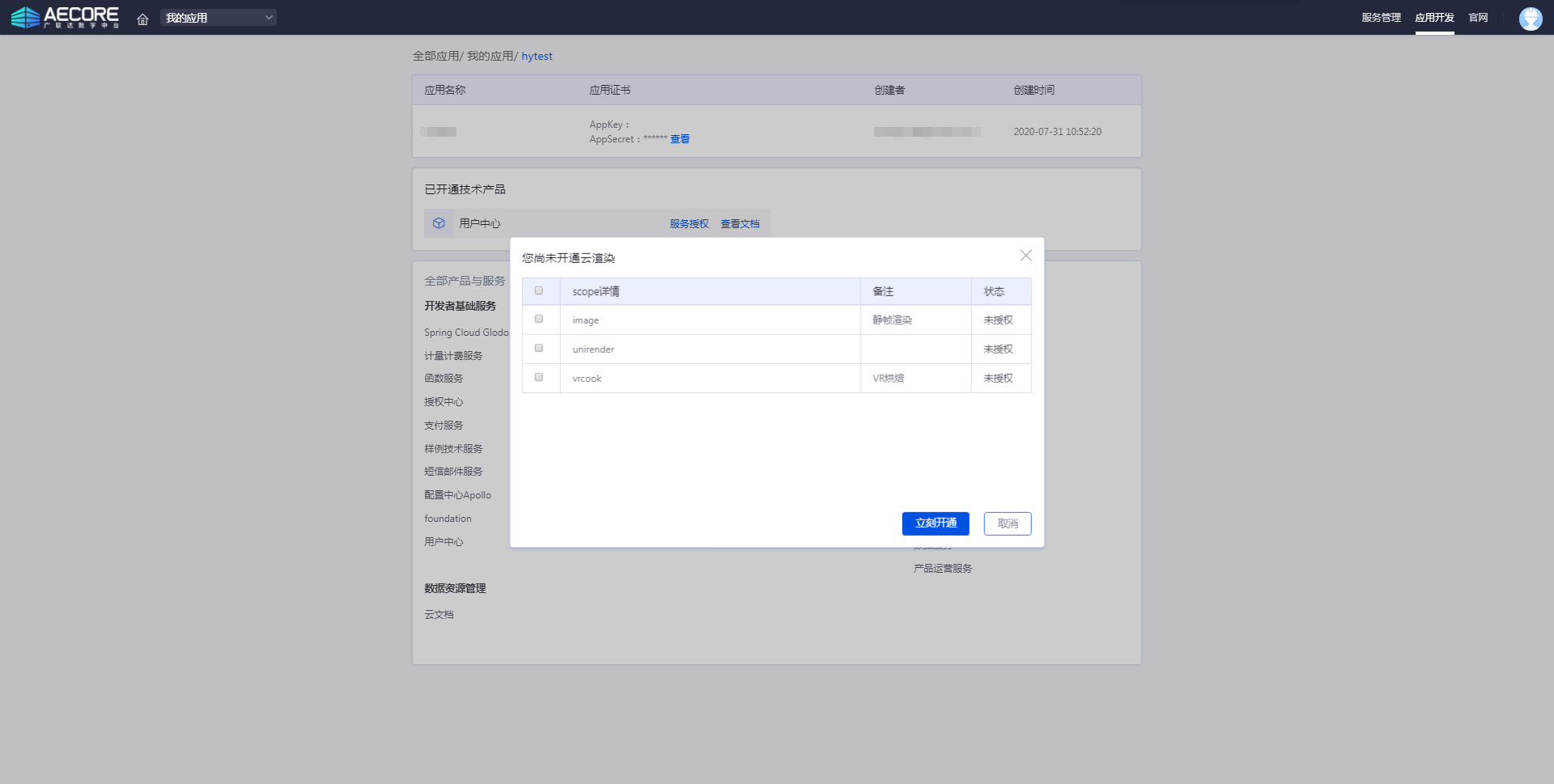 首先需要通过AECORE创建应用,申请开通云渲染服务权限,待审核通过,即可开通云渲染服务。